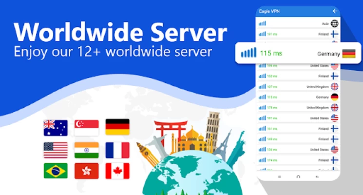 Eagle VPN is a super fast VPN! It will automatically connect to the fastest vpn server. Eagle VPN has over 1000 IP addresses for more than 50 free vpn servers and streaming server. One click to connect to US, UK, Korea, Russia, India, German, France, etc.