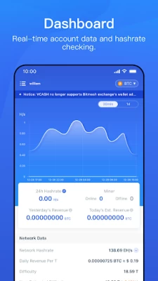 The f2pool app offers a simple way for everyone to manage their mining operation. Conveniently manage your mining machines, view your revenue, and even utilize our one-click button to switch between logged-in and anonymous mining. Miners can access every function of the website through the app, including the ability to set up custom alerts for any worker or group.