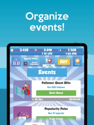 Get ready for a fun gaming experience!Introduce yourself to a brand-new idle clicker game where you gain followers by clicking the screen and elevate your popularity by customizing your character.Increase your follower and like count with upgrades, gain special advantages with the card mechanics, and multiply your rewards by completing tasks on the map.