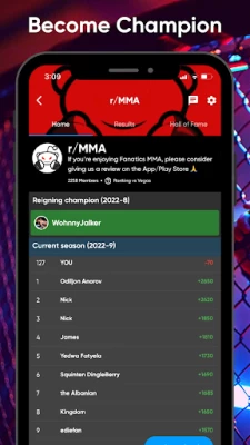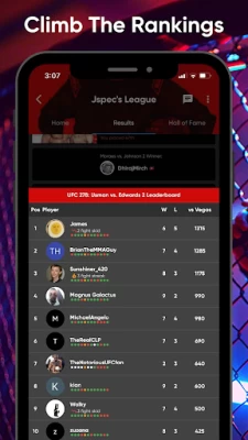 Create your own custom rules and decide which fight organizations and scoring method you want to compete in. (ex. UFC only, scoring: win/losses)