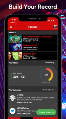 Seamlessly swipe and click between groups, events, picks, fighters, - records, results, schedule, stats, chat, news, and leaderboards