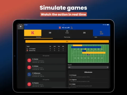Live Play Map: Experience the action like never before! When simulating a game, you can now view the position of plays on a 2D field.