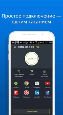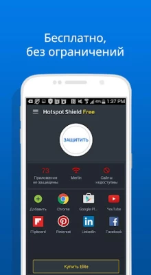 Сервис Free VPN – Hotspot Shield Basic на 100 % бесплатный, неограниченный, безопасный и очень простой в использовании. Основные возможности Free VPN – Hotspot Shield Basic