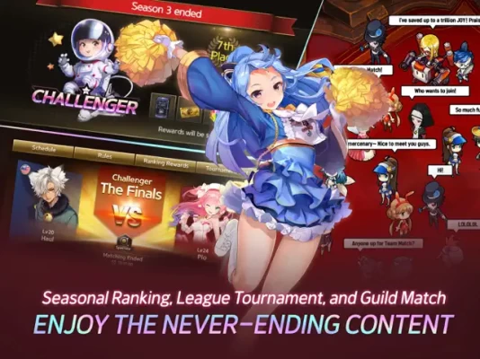 - Enjoy seasonal ranking, league tournaments, and guild match!