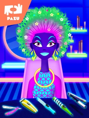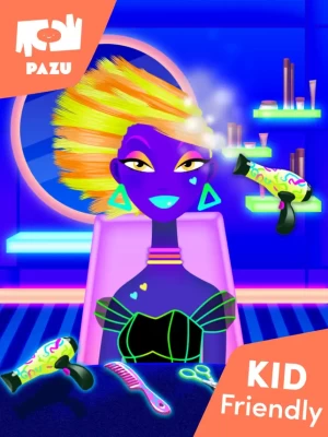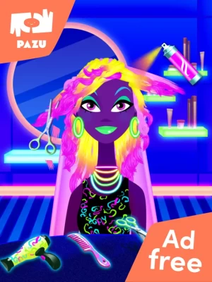 Girls Hair Salon is a fun and interactive game from developers PAZU Games. Now you can own your own hair salon where you can color, cut, and dress your very own animated characters! Become the fashion glow stylist you’ve always wanted to be and makeover your character as you wish. Girls Hair Salon is a hair game full of interactive features and innovative tools to help you become the neon costume stylist you’ve always dreamed of and turn your characters into glow star! Here’s how!