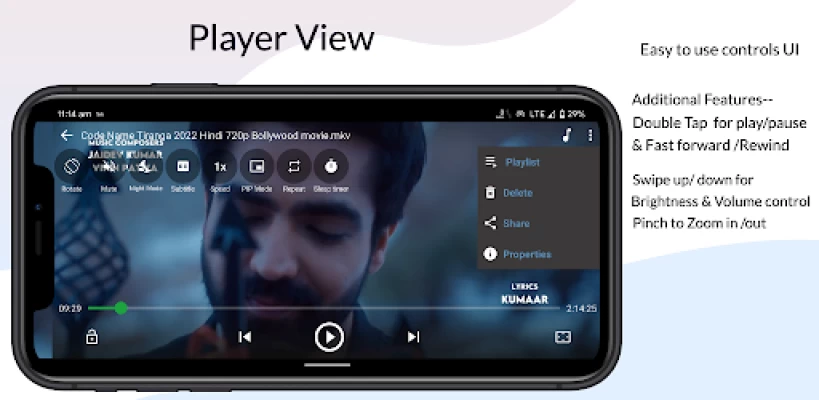 - Multi playback option: auto-rotation, aspect-ratio, screen-lock, sleep timer, repeat/loop etc.