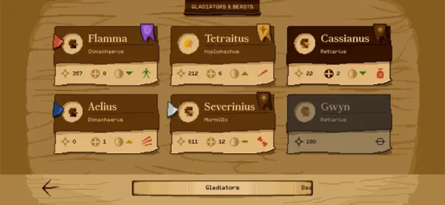 To organize your gladiators effectively, you handle their injuries, and maintain their loyalty. Level up their attributes, select techniques, and choose fighting styles to optimize their performance in battle.