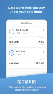 • Instantly know every time a new app accesses the network and begins using Wi-Fi or mobile data.