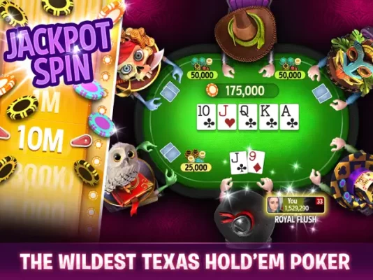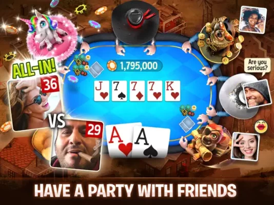 Enjoy Texas Holdem in: Cash games, tournaments, Spin & Play, Sit & Go, Royal Poker, Party Poker, friends games, Heads-up, online Blackjack 21, PVP and Wild West saloon tourneys!