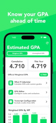 You no longer have to wait for the end of the semester to know your GPA. GradeWay calculates your weighted and unweighted GPA using all of your averages, your transcript, and all your credits. View GPA breakdowns, edit scales, and exclude courses to improve accuracy. Use the built-in what if calculator to predict changes to your GPA.