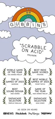 Gubbins is a friendly puzzle game where players place tiles to construct words, with the help and hindrance of wildcard modifiers called Gubbins.