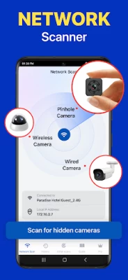- Network Scan: Identifies connected devices on your Wi-Fi network, helping you uncover hidden cameras or suspicious devices. Keep your privacy intact in places like hotels, bedrooms, and offices with Network Scan.