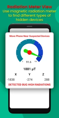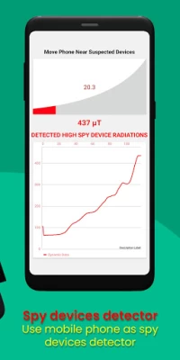 Hidden devices detector free app for android will detect spy devices like hidden spy camera hidden spy microphone bugs infrared camera, so do not wait download this hidden spy devices detector app for android now. If your phone doesn't have magnetic sensor, then radiation detector will not work on your phone, so be patient and try to use our app next feature infrared detector.