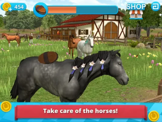 Your dear horses can only do their best if they’re taken care of, so you’ve got to fulfill their needs and wishes. Feeding, brushing, and combing are all on the agenda, but of course there’s also time for some cuddles! After lots of fun out in the meadow, the course will be no problem for the two of you.