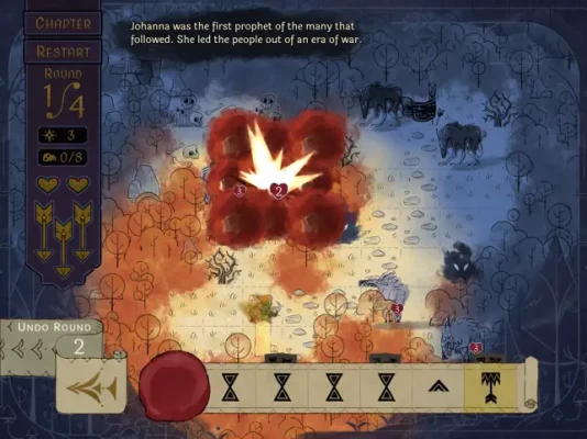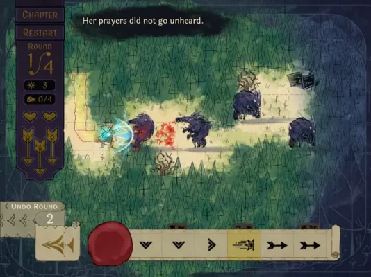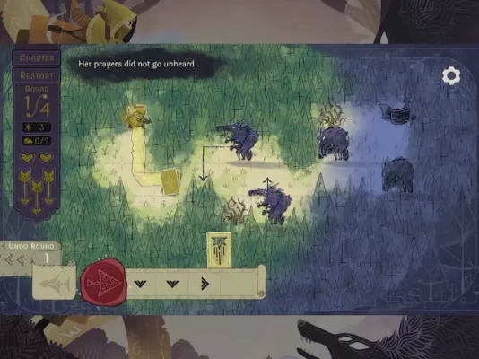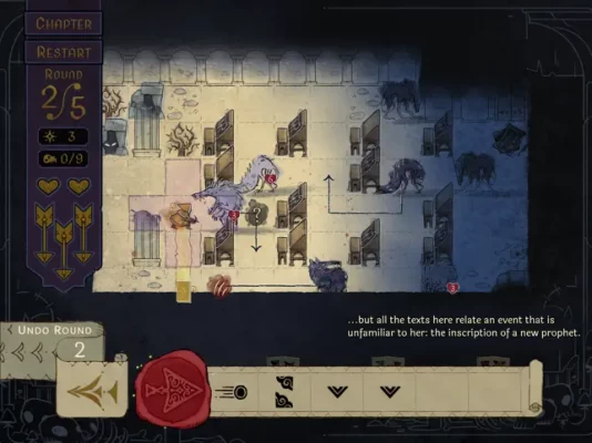 Not only do you have your wits to rely on while plotting your attack, you also have an array of abilities at your disposal. As you slay more wolves, you acquire skills like Vault, Smoke Bomb, and Piercing Shot. Venture forth on your journey to upgrade your skills and unlock more Action Slots and Undo Round Points. As you plan your moves, you will also shape your own prophecy, composing a dynamic work of scripture as you fight.