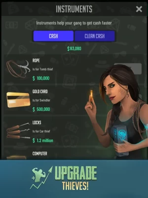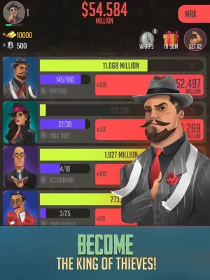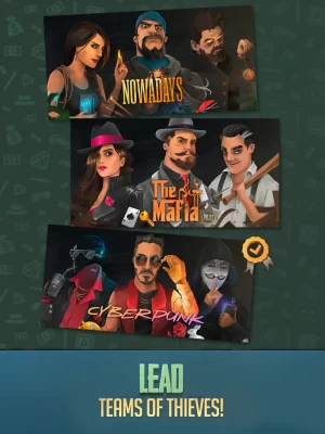 Manage your team of thieves with superpowers: 1. Pickpocket 2. Thief 3. Tomb thief 4. Swindler 5. Car thief 6. Hacker 7. Hypnotist 8. Senator 9. Dream rider 10. Prophet