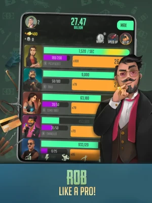 Your team will help you to steal all money and be the richest human ever lived. Upgrade them to get more profit and speed of stealing money.