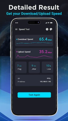 Conduct a thorough analysis of your internet download, upload speed, and ping test in a single tap with the Wi-Fi Analyzer, connected to servers worldwide. Internet Speed Test meter tool allows you to assess the performance of various networks, including mobile internet (3G, 4G/LTE, 5G), Wi-Fi, DSL, and ADSL.