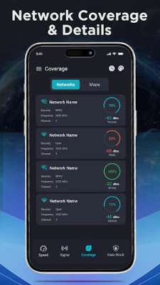 - Check data usage in Mbps, view network details, and connect seamlessly.