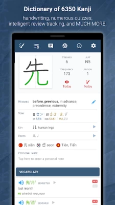 ✓ Powerful kanji search tools by radicals, meanings, on/kun readings, JLPT levels, etc.