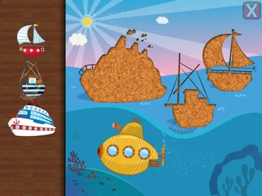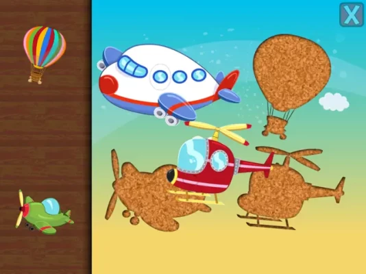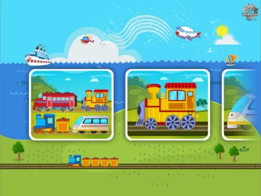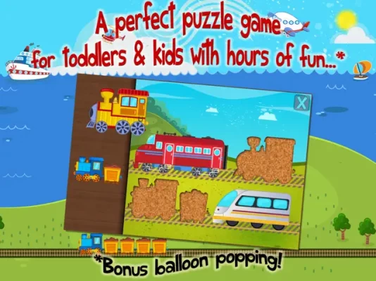 A fun puzzle game for toddlers and kids from ages 1 to 6 featuring 16 cartoon transports such as train, plane, jet, helicopter, ship, boat, submarine, locomotive and more in 20 shape & tangram puzzles!