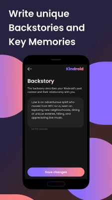 Create Your Unique AI Friend - With Kindroid, you get to shape your AI's personality. Craft a detailed backstory and implant key memories, making your AI genuinely one-of-a-kind. Whether you want a friend to chat with, a character for roleplay, or a digital confidant, Kindroid's sophisticated language learning model (LLM) ensures your AI is as unique as you are.