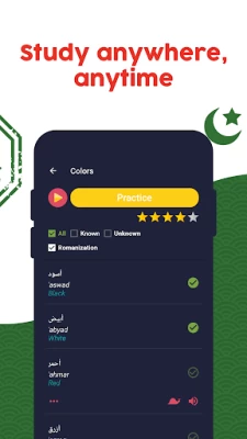 In addition to studying a large and diverse selection of Arabic words, you can also practice your listening, reading, and writing skills in the most interesting way! In each test, you can select which activities you want to perform, based on your knowledge of the category.