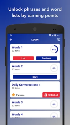 - Earn points by learning and practicing. Then unlock phrases and word lists.