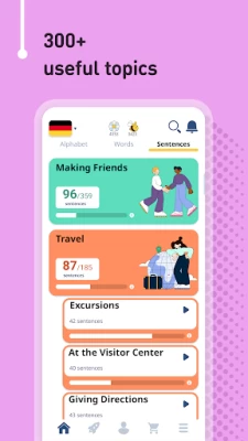 • 5,000 German phrases (frequently used): the most important phrases for daily conversations and travelling, categorized into 7 levels and 120 topics.