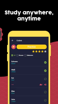 In addition to studying a large and diverse selection of German words, you can also practice your listening, reading, and writing skills in the most interesting way! In each test, you can select which activities you want to perform, based on your knowledge of the category.