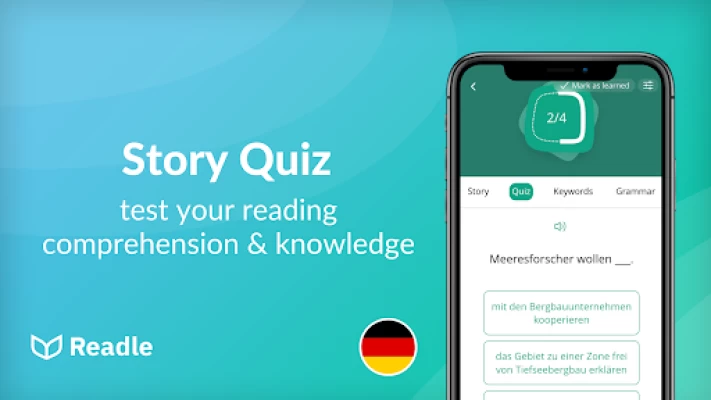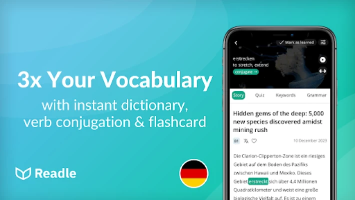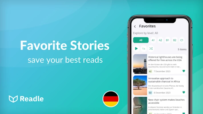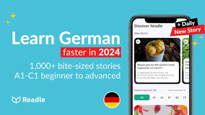 Readle is a unique and effective German language learning app. Learn German in context with more than 1,000 easy and entertaining stories on your level. Build your German vocabulary with smart flashcards from the topics you enjoy the most.
