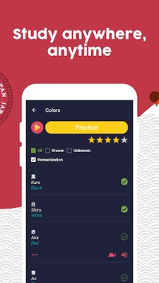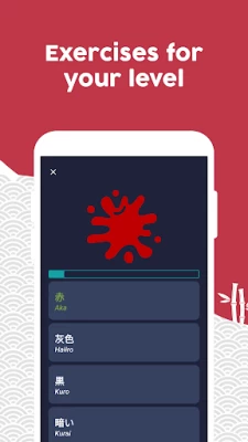 In addition to studying a large and diverse selection of Japanese words, you can also practice your listening, reading, and writing skills in the most interesting way! In each test, you can select which activities you want to perform, based on your knowledge of the category.