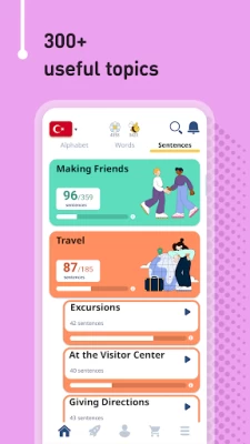 • 1,250 Turkish phrases (frequently used): the most important phrases for daily conversations and travelling, categorized into 7 levels and 120 topics.