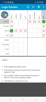 Enjoy Logic Puzzles with 100 unique brain puzzles of increasing difficulty and multiple sizes with no ads. These logic puzzles will keep your brain active and improve your cognitive skills. Smart Hints will teach your brain how to play and help your brain learn new patterns. Use the clues to fill in the grid and solve each logic puzzle. Work your way up from from a logic puzzle beginner to master! Use unlimited Smart Hints to see exactly which clue applies to the current board and why. Start with small 3×4 logic puzzles or challenge your brain with huge 4×7 cell puzzles.