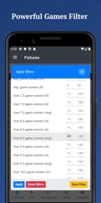 Games Filter - Search games that meets your criteria. E.g.: see only games with more than 70% over 2.5 game goals in last 5 games at home. You can search by any stat you want.