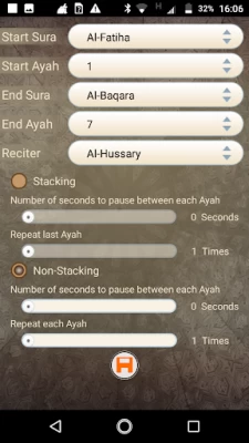 o “Stacking” feature is the highlight of this unique App. It enables to memorize better and faster with repeated playing of the previous Ayaas in a Stacking manner, thereby helping to remember the connection between Ayaas - one of the difficult aspects of memorization.