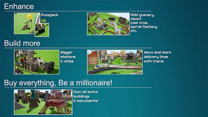 Put engines and wagons on the built track and just push them with your finger, and they start to move. They will travel the prepared track and stop automatically at the placed industrial buildings and stations. The trains will deliver automatically food, steel and oil to the city stations, and if your cities are big enough you can transport passengers between them.