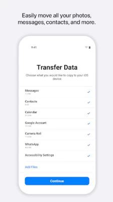 Everything about iOS is designed to be easy. That includes switching to it. With just a few steps, you can migrate your content automatically and securely from your Android device with the Move to iOS app. No need to save your stuff elsewhere before switching from Android. The Move to iOS app securely transfers all kinds of content data for you: