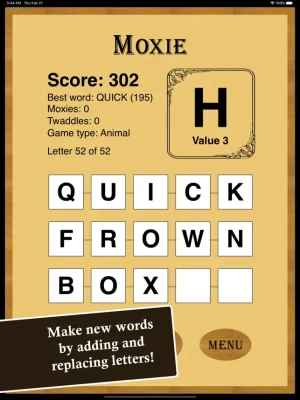 Moxie is all about transforming words into new words. You start with a hand of 52 letters that you go through "Solitaire" style. Place each letter on the board or "Pass". If you "Pass" you can't go back to that letter.