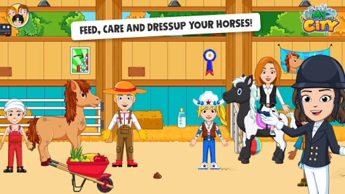 Have you always wanted to have your own horse? Now you can! My City : Horse is all about having your own stable to take care of your cute and playful horse. Just like a real stable, our new kids game features horse care, Horse Riding and even horse training. Have a horse race, train your cute horse, ride and groom? It's easy. Everything is possible with our new horse game.