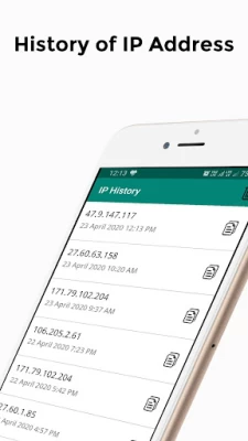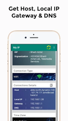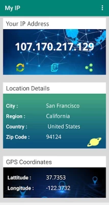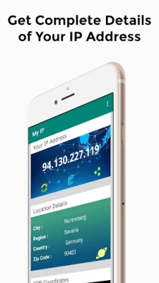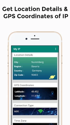 The App shows City, Region, ZIP Code. The app shows GPS Coordinates (Approximate Latitude and Longitude of your Current IP Address). The App maintains history of IP Addresses used previously.