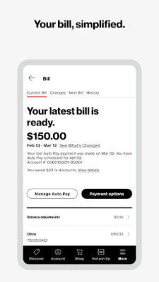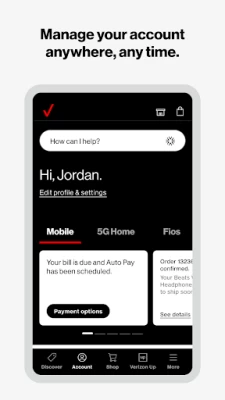 • Oversee all your accounts in one place—both your mobile plan and Home plans including Fios or 5G Home Internet.