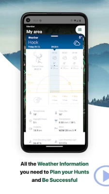 - Weather Forecast and Rain Radar: Including hourly data, a 7-day forecast, wind direction and strength, first and last shooting light, and solunar phases to anticipate animal behaviour and improve hunting success.