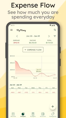 MyMoney features analysis with various clean charts - Income-expense pie chart, cash flow chart and account contribution bar chart. Take a look on the expense flow to better understand your spending habits.