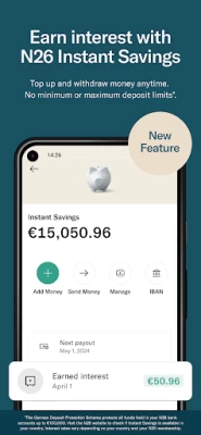 Earn interest on your savings with full flexibility and no minimum or maximum deposit limits*. The interest rate is based on country and membership. Available to eligible N26 customers in Germany and Spain.