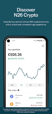 Invest the simple way without having to switch apps. Buy stocks, ETFs, and cryptocurrencies like Bitcoin and Ethereum right in your N26 app*. (*N26 Crypto is powered by Bitpanda. Check our website for availability in your country. None of the statements constitute investment advice).
