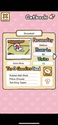 Attract cats with food and then watch them romp with your toys! More than 40 varieties of cats—white and black, tabby and calico—might stop by. Rare cats are rumored to roam the neighborhood too, but you'll need particular items to entice those elusive felines. Each visitor is logged in your Catbook. Become a master kitty collector and fill it up!