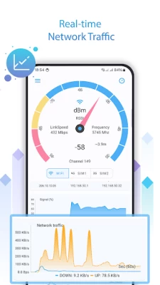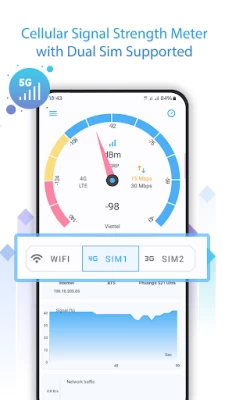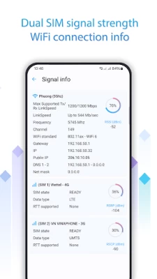 View 2G, 3G, 4G, 5G cellular signal, Network operators, Sim operator, phone type, network type, network strength in dBm, IP address,...