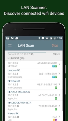 It is equipped with a fast wifi device discovery tool, including all the LAN device's addresses, manufacturers and names. Further, Network Analyzer contains standard net diagnostic tools such as ping, traceroute, port scanner, DNS lookup, and whois. Finally, it shows all neighbouring wi-fi networks together with additional details such as signal strength, encryption and router manufacturer to help discovering the best channel for a wireless router. Everything works with both IPv4 and IPv6.