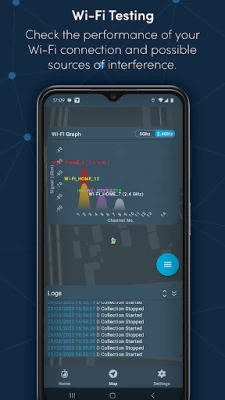 > Check your internet connection by performing speed tests, whilst simultaneously measuring key Wi-Fi statistics such as signal strength, frequency band, channel number, SSID and BSSID